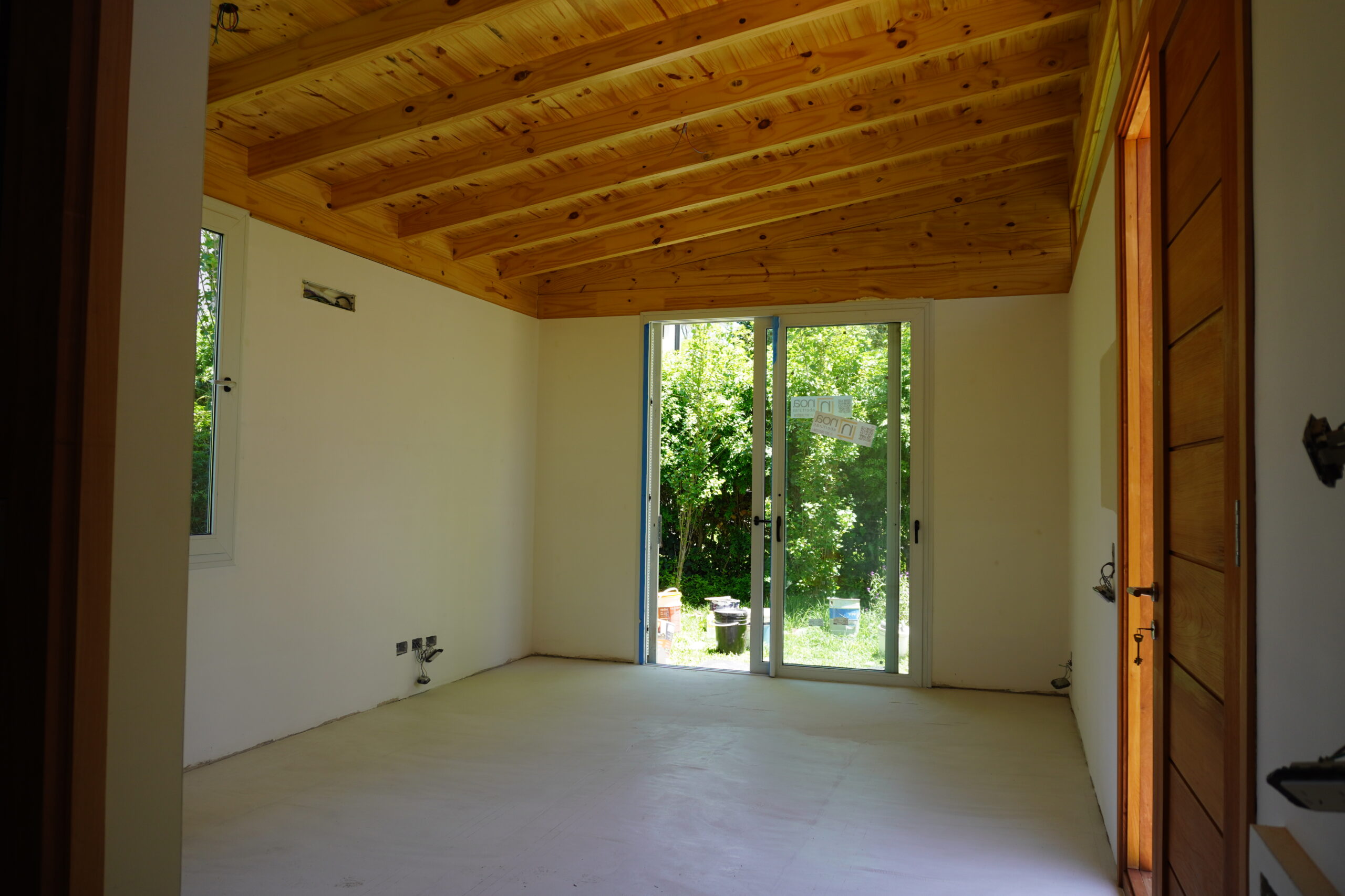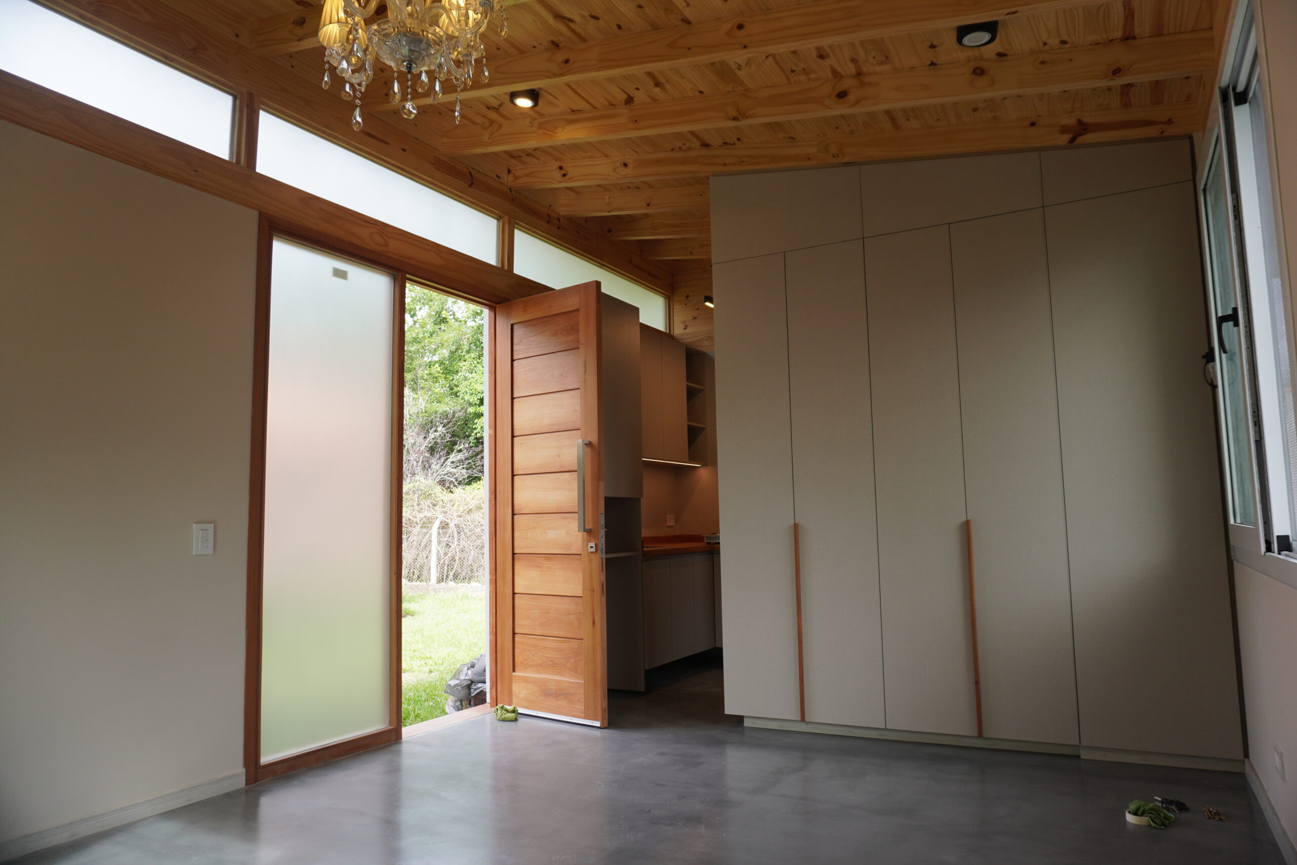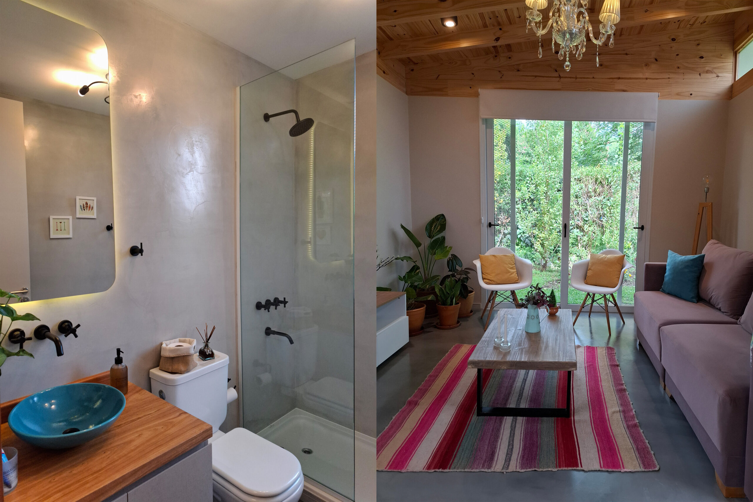 En los 32m2 interiores se resuelve un ambiente de usos múltiples, un gran mueble de guardado, kitchnette, un espacio técnico y baño completo.
